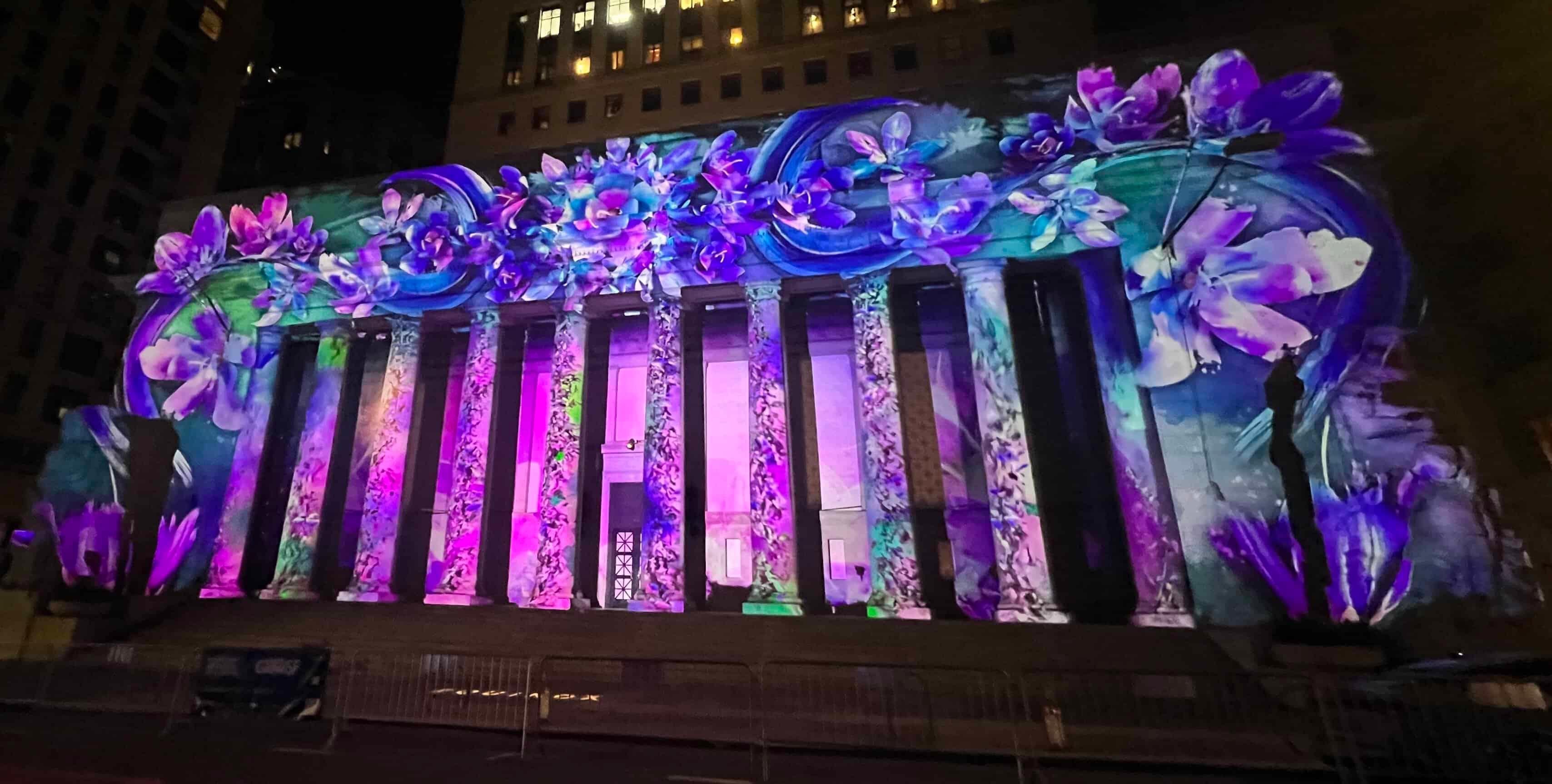 Bringing Lightweavers: Painting Love to life on the historic Pacific Coast Stock Exchange building, Float4 created a dreamlike world where shimmering light reveals organic textures, evoking the warmth and wonder of the winter season.