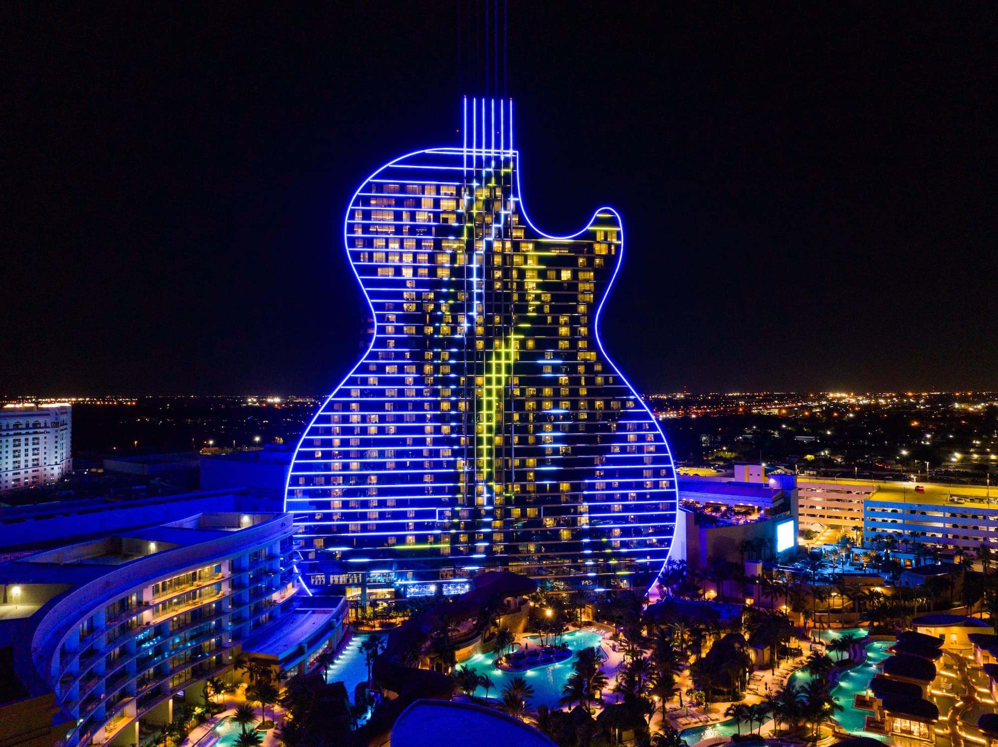 The Seminole Hard Rock Hotel & Casino, a global icon of entertainment, turned to FLOAT4 to create an all-new Guitar Show. Expanding on our 2019 debut, we transformed the hotel’s striking facade—featuring 16,800 LED video fixtures and six lasers soaring nearly 20,000 feet—into a vibrant stage for a fully reimagined experience.